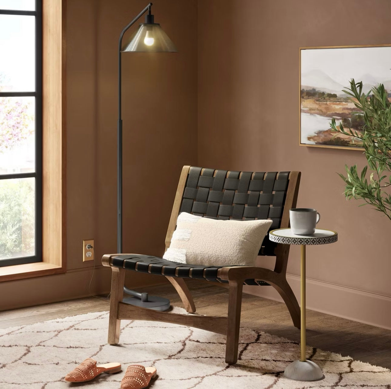 Su estructura metálica en color negro y pantalla de vidrio ahumado en forma de cono crean una iluminación cálida y moderna, ideal para complementar salas, recámaras o rincones de lectura.