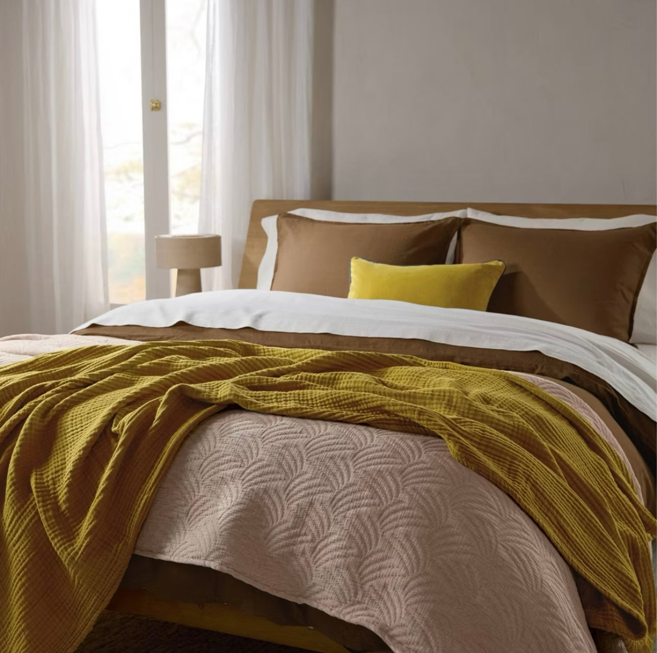 Confeccionada en gasa de algodón 100% premium, esta manta ligera y transpirable es ideal para una siesta rápida, para acurrucarte en el sofá o para decorar tu cama con estilo. Tan suave como aireada, te envuelve con una sensación tipo nube, perfecta para cualquier momento del día.